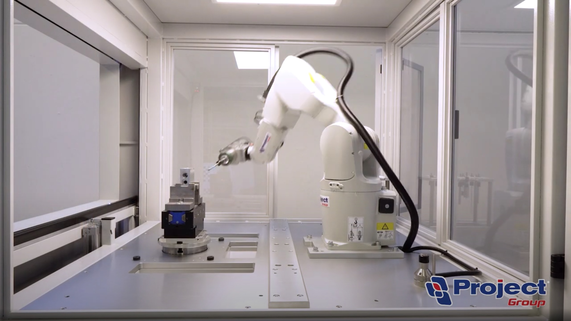 La nuova isola robotizzata MillingCAB di Project Group è in grado di effettuare la sbavatura di distributori idraulici/oleodinamici e affini, in particolare la loro sbavatura interna delle forature incrociate, delle cavità interne ed eventuale sbavatura esterna.